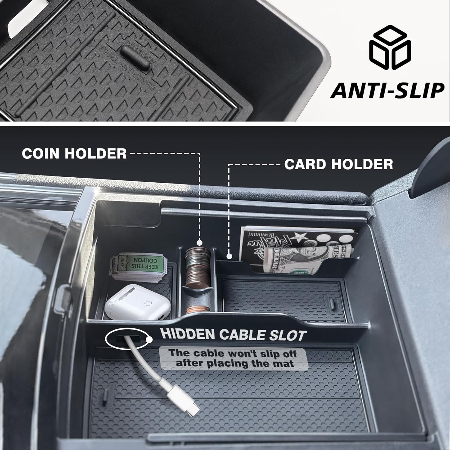 - Function: Upgrade your storage space. Compartmental design helps to keep your items organized neatly. Provide a perfect way to store your daily items while creating hidden storage space underneath. Won't affect the console lid closing and opening. The default insert mats fits in each comparment and make it easy to clean and prevent your items from rattling