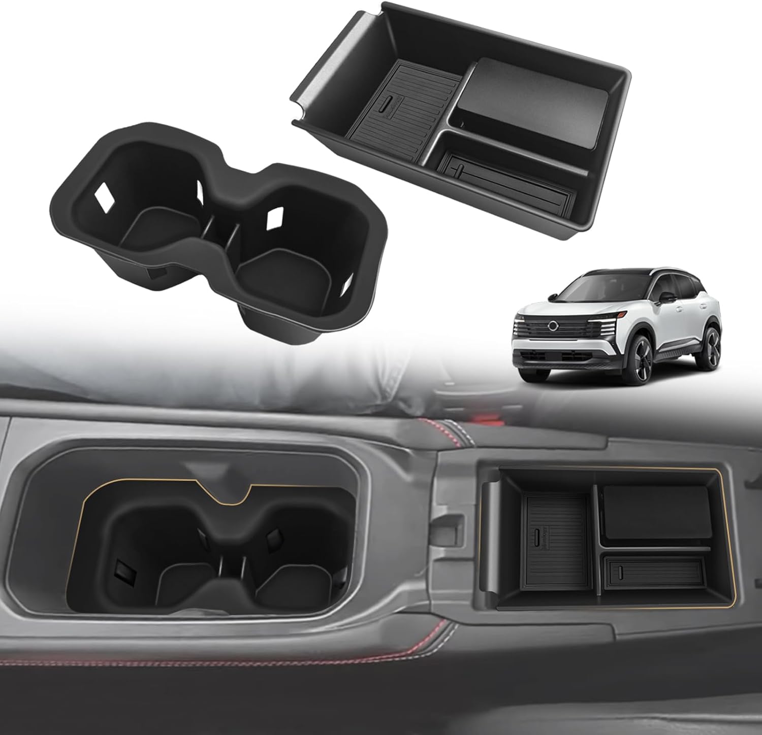 Muslogy Center Console Organizer & Cup Holder Insert 2PCS Set Compatible with 2025 Nissan Kicks Accessories Armrest Box Divider Storage Tray and Drink Stopper Non-Slip (Console Tray & CupHolder)
