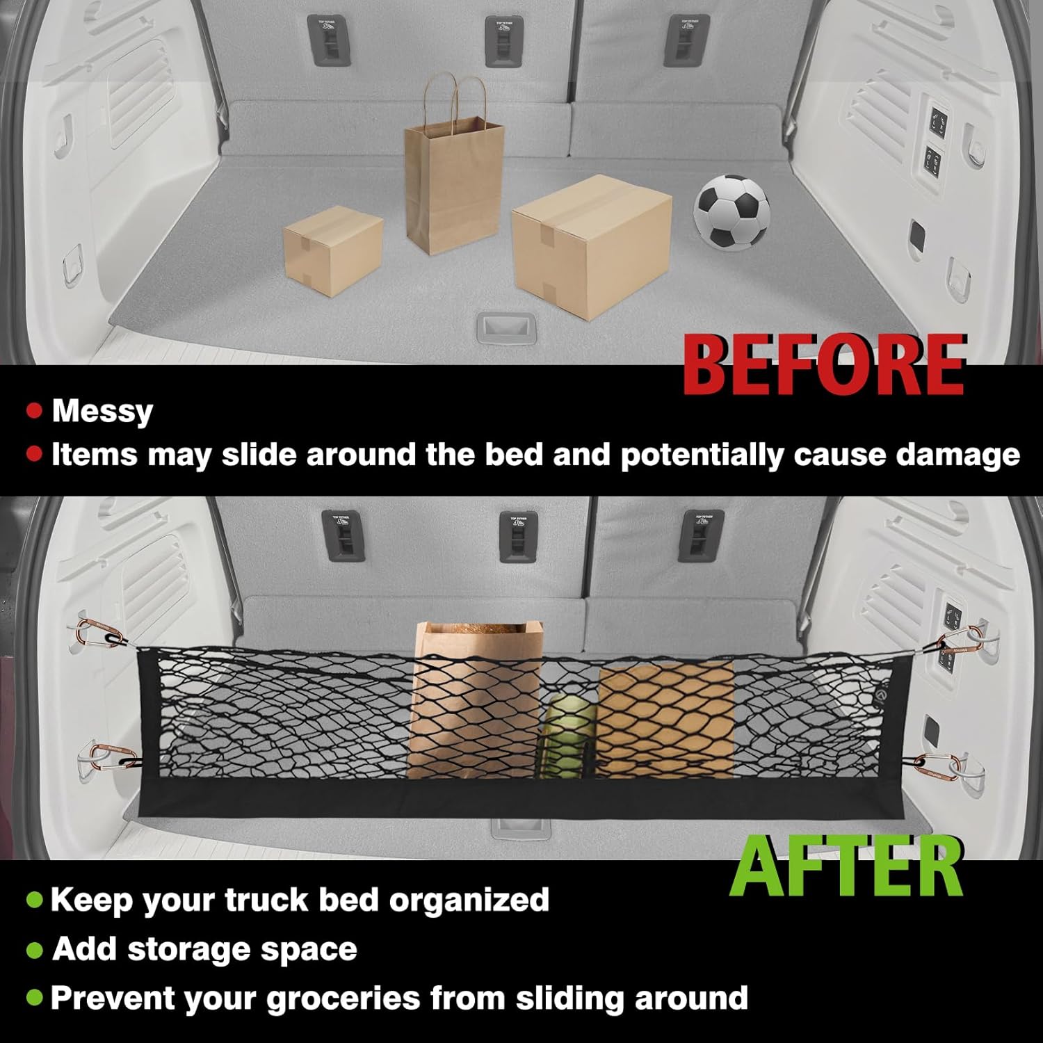 - Function: Maximize your storage space. Organize and store groceries, gear, tools or other items securely, and prevent your items from rattling or sliding while driving.