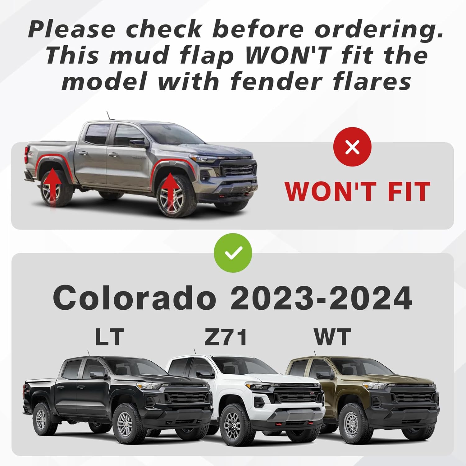 - Perfect Fitment: Muslogy for Colorado 2023 2024 2025 Mud Flaps are designed according to 3D laser scanning to make it fit your Colorado perfectly. 【Please check if there are fender flares on your truck. This mud flap WON'T fit the model with fender flares】