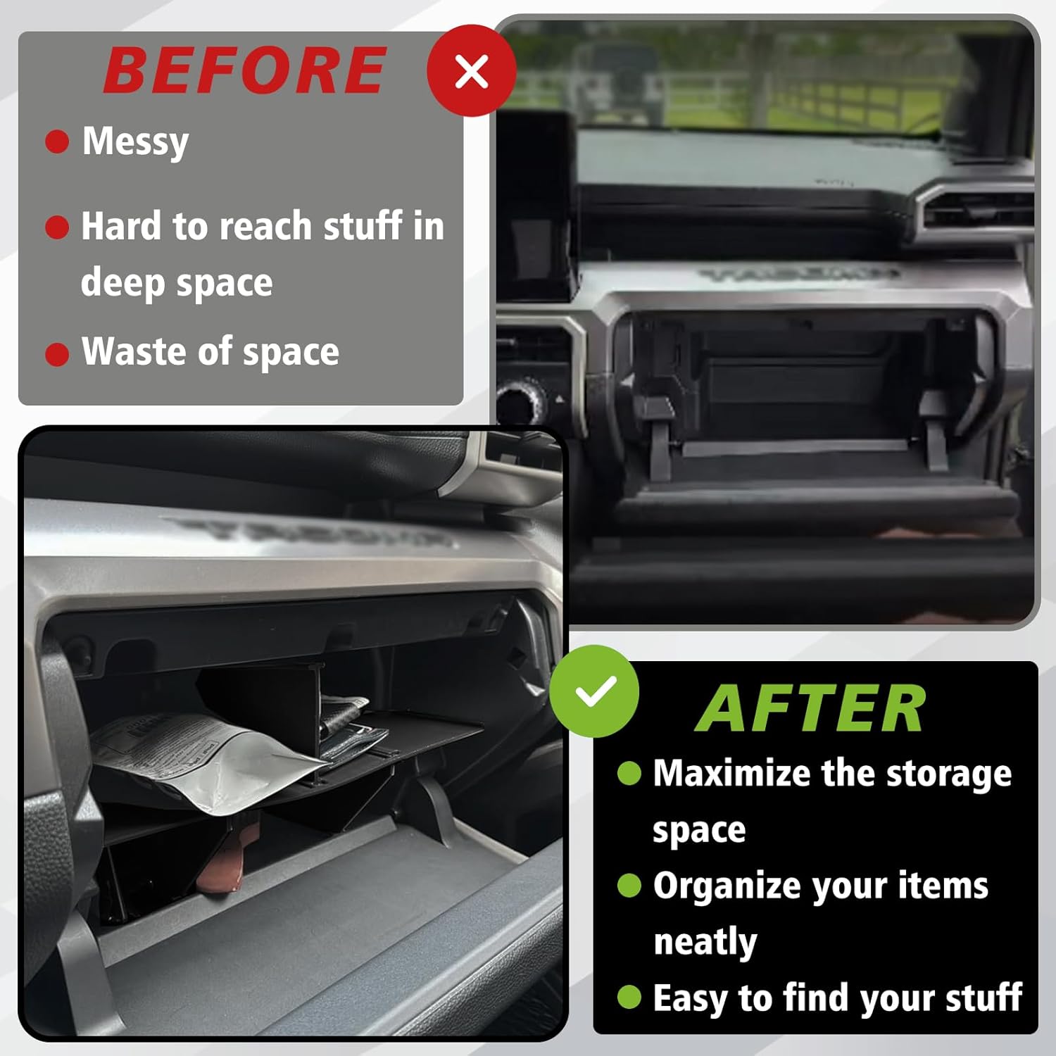 - Keep Items Organized: Divide the massive and deep glove box into different compartments for every Tacoma owner to store your stuff from different sizes and make it neatly. providing quick access to your daily items without digging in the massive box. Makes it easy to organize your daily items such as sunglasses, keys, cards, gum, etc. in daily life and short trips.