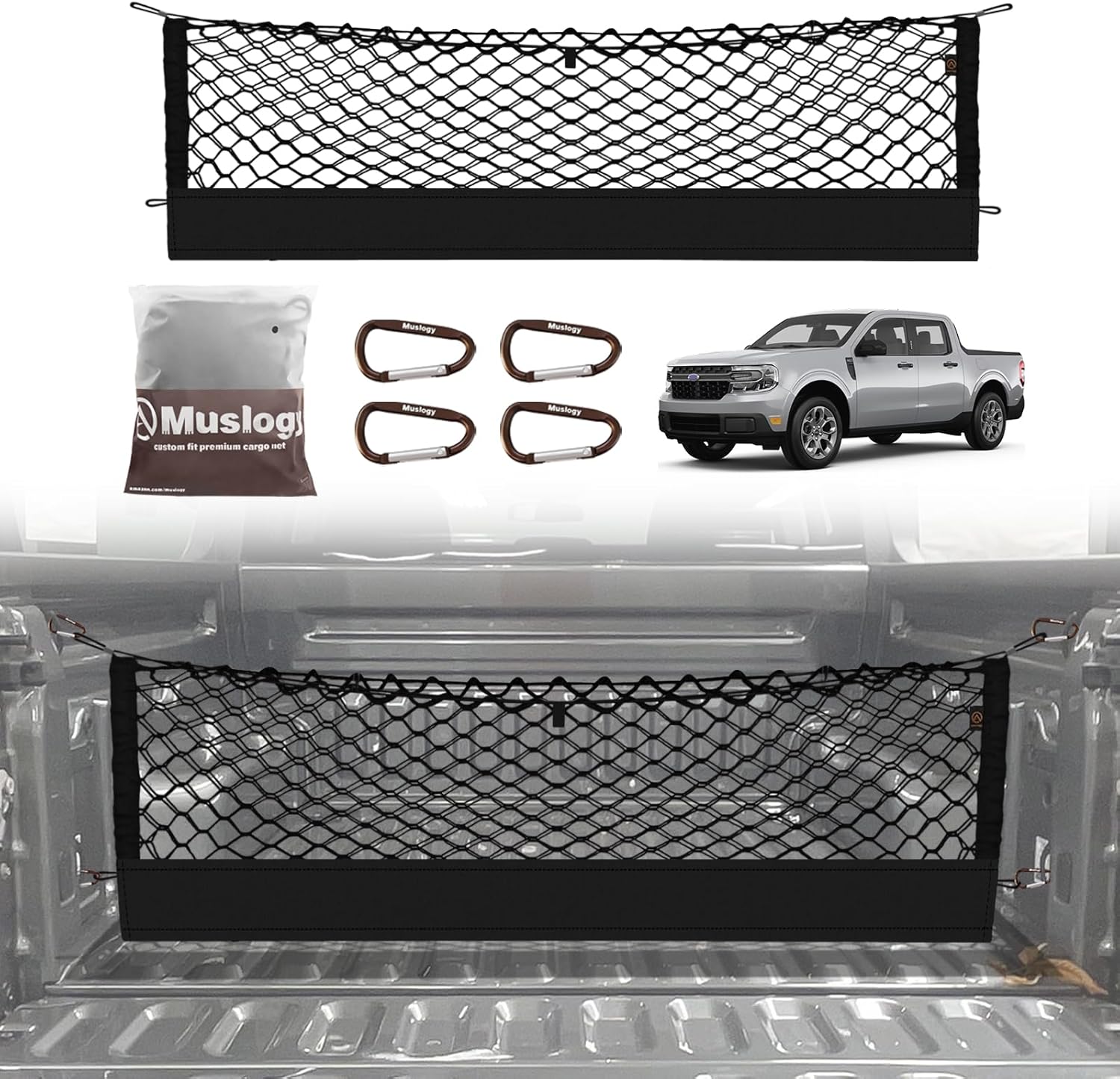Muslogy Truck Bed Cargo Net Compatible with 2022-2024 2025 Ford Maverick Accessories Envelope Style Bed Net Trunk Organizer - Upgraded Support Stability Rope with Metal Carabiners Tight Fit, Won't Sag