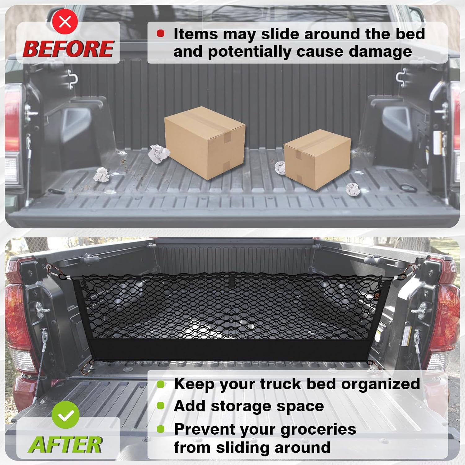 - Stay Organized: Add a storage space to organize or store groceries, camping gear, fishing tackle, picnic equipment, and outdoor items and prevent your groceries from rolling while driving. Taking up very little space when not filled with stuff.